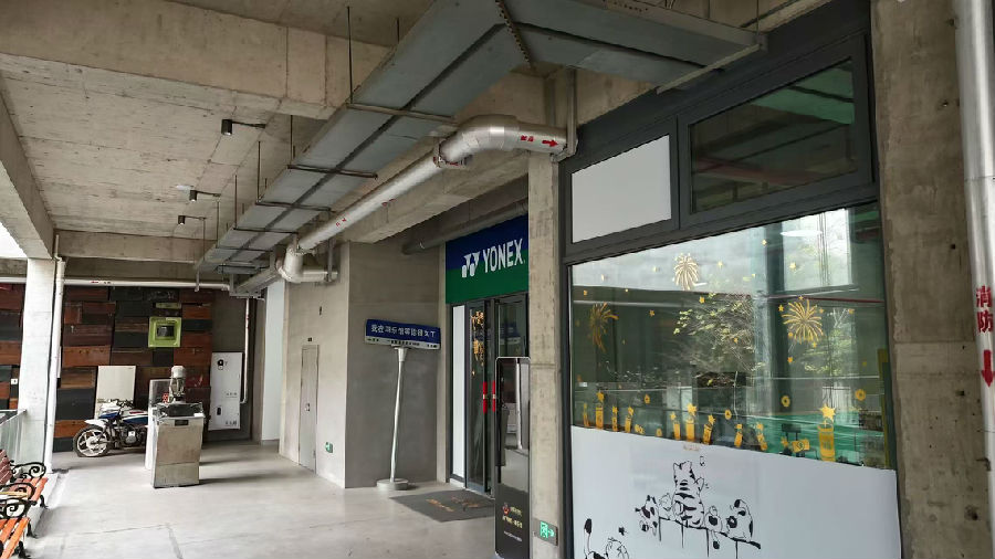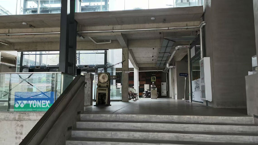 进入园区后,沿着去往停车场的导视牌走,把车停在到球馆的后门,就是原来的位置,穿过一楼的一个回廊,就能看到大厅前放置一辆摩托车的电梯间了,坐电梯到二楼,球馆就在左手边: